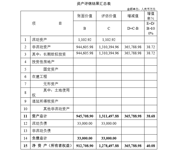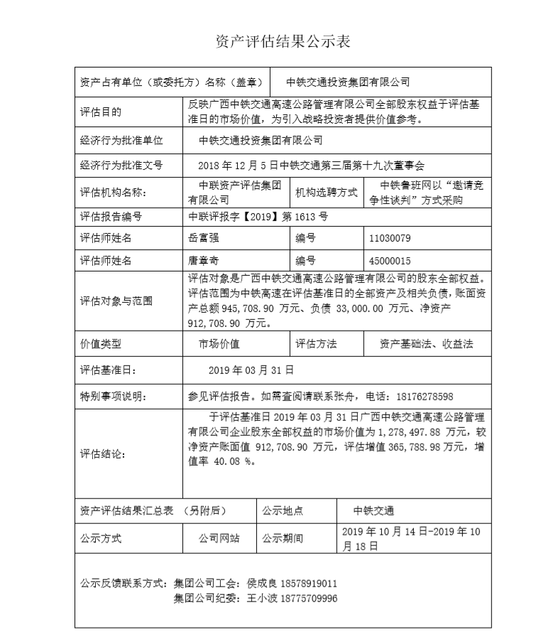 2018年12月5日,經中鐵交通集團第三屆第十九次董事會審議通過引入戰(zhàn)略投資者的議案,并就中鐵高速全部股東權益組織了資產評估。根據國資委《關于建立中央企業(yè)資產評估項目公示制度有關事項的通知》(國資發(fā)產權〔2016〕41號),以及股份公司《中國中鐵股份有限公司資產評估公示暫行辦法》(中鐵股份財務〔2016〕153號)的要求,現將資產評估結果進行公示。